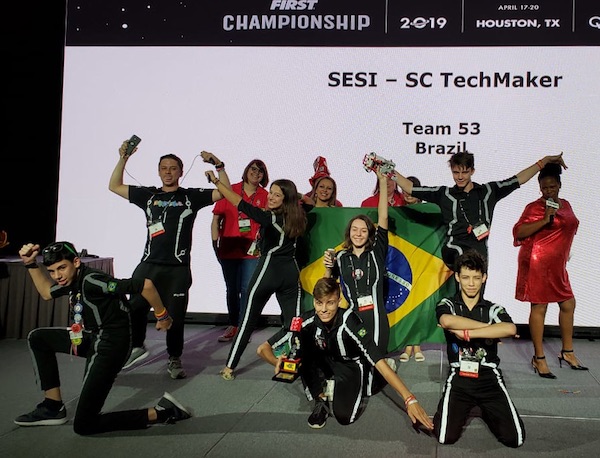 Há poucos dias, duas equipes catarinenses foram destaque em um dos principais torneios de robótica dos Estados Unidos, a First Championship, que reuniu estudantes de 60 países em Houston: representando Blumenau, a Techmaker (foto) – formada por seis alunos de escolas públicas e privadas – ficou em 12º. lugar no Desafio do Robô e venceu o troféu “Gracious Professionalism”, concedido ao grupo que mais demonstra respeito entre os colegas do time e os demais competidores. A outra participante catarinense foi a AgroRobots, com estudantes de Seara e Concórdia, que obteve o 14º melhor desempenho no Desafio do Robô entre as 108 equipes participantes.