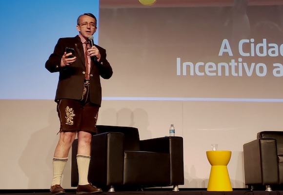 “Atingimos um grau de maturidade que nos permite crer que Blumenau é, hoje, uma das melhores cidades para se investir no mercado de tecnologia porque ela oferece formação de mão de obra e condição para essa mão de obra viver sem custo tão elevado”, ressaltou o prefeito Mario Hildebrandt que, como os empresários que foram promover a cidade em São Paulo na década de 1990, se apresentou em trajes típicos alemães.