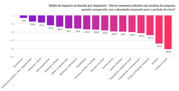 Os setores mais afetados foram Turismo & Lazer (-80,8%), Eventos (-67,4%), Varejo e Pequenos Comércios (-47,2%). Já que apresentaram os menores impactos foram E-commerce (-5,8%), Financeiro, Jurídico e serviços relacionados (-14,8%) e empresas de Software e Cloud (-17,2%). As empresas que vendem serviços para o mercado corporativo (B2B) tiveram uma queda de faturamento menor (-29,3%) do que as tem como público-alvo o consumidor final (B2C), com impacto de -46%.
