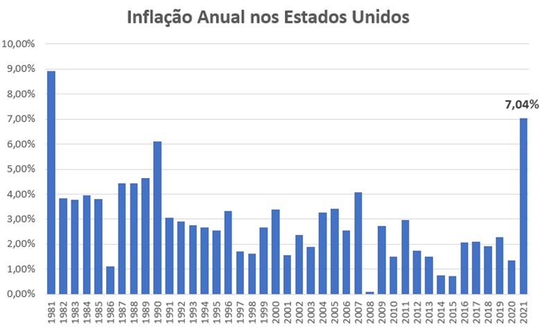 Com um pouco de estudo de macroeconomia, podemos imaginar que despejar dinheiro a rodo na economia – foram mais de U$ 2 trilhões nos Estados Unidos através do pacote de estímulos aprovado pelo presidente americano Joe Biden em 2021 – poderia causar um aumento abrupto nos níveis de inflação dos países, fazendo com que os mesmos precisassem aumentar as taxas de juros para desincentivar o consumo. Nos estados Unidos, o índice de inflação chegou a 7,04% em 2021, o maior valor registrado desde 1981: