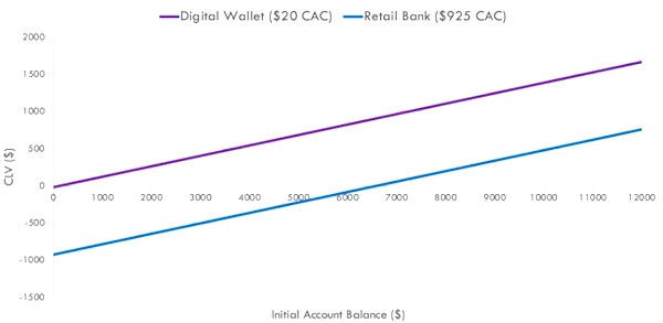 Dessa maneira, clientes passem a ser lucrativos para uma fintech com um depósito inicial de aproximadamente 150 dólares, enquanto para bancos tradicionais esse depósito inicial passa a ser algo entre 6.000 e 7.000 dólares. No gráfico abaixo, é possível visualizar o LifeTime Value (eixo vertical) de clientes com diferentes depósitos iniciais, tanto para fintechs quanto para os grandes bancos: