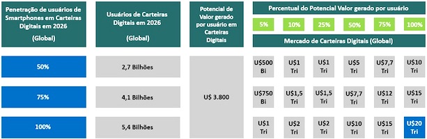 Avaliando alguns cenários distintos para o crescimento do setor de carteiras digitais, podemos estimar um crescimento composto anual (CAGR) para o segmento de 78% mundialmente até 2026, saindo de um valor de mercado de U$ 1,1 trilhões em 2021 para U$ 20 trilhões em 2026. Essas premissas são baseadas em estimativas do potencial de valor gerado por usuário dentro de funcionalidades de carteiras digitais, como: custódia de valores financeiros, taxas de pagamentos, crédito pessoal, seguros, investimentos (ações e criptoativos), Web 3.0 e E-commerce.
